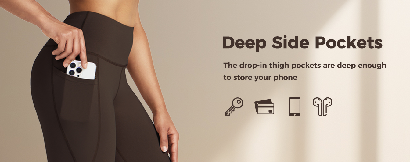 CONVENIENT POCKETS -Two deep enough side pockets for your phones, cards, and keys, set your hands free during workout or yoga.