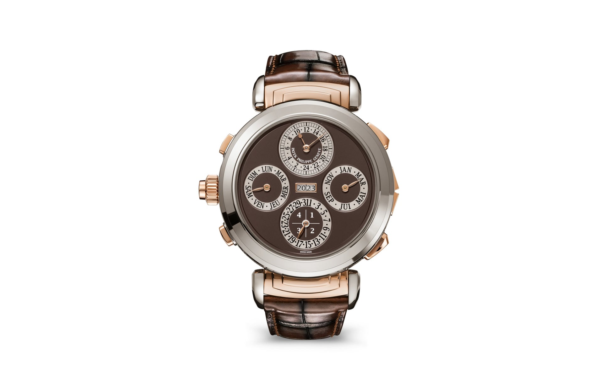 This watch reinterprets the design of its most complicated wristwatch by offering it for the first time in a 'two-tone' version combining white gold and rose gold, along with brown opaline dials.Among the 20 complications are five acoustic functions, including two patented world exclusives: an alarm sounding the programmed time and a date-repeater striking the date on demand.The reversible double-sided case is distinguished by its patented swivel mechanism, enabling it to be worn with either dial visible.This watch is accompanied by white gold cufflinks featuring a brown opaline center adorned with hand-guilloched hobnail pattern and a rose gold Calatrava cross.