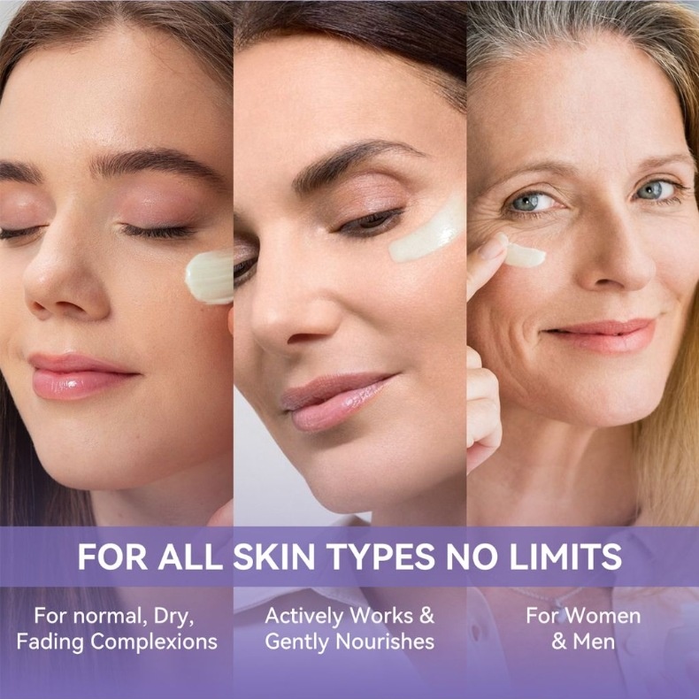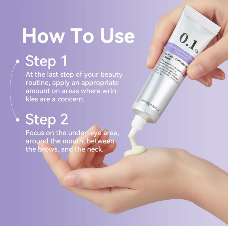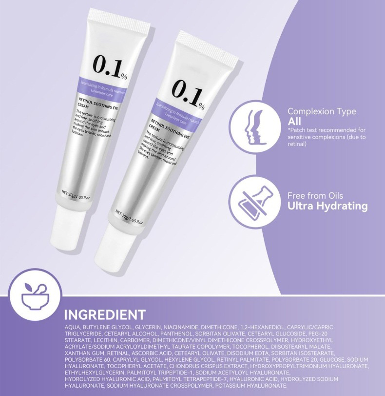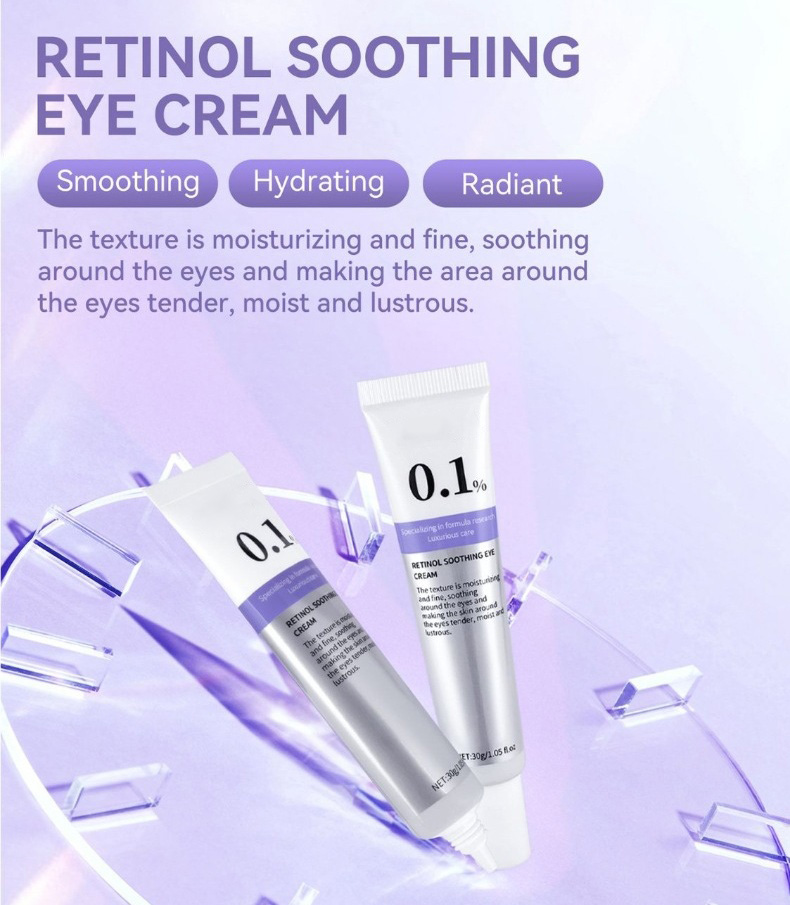 Begin your transformation here! This image presents our luxuriousĀ Retinol Soothing Eye Cream, featuring a potent yet gentleĀ 0.1% concentration. Its moisturizing, fine texture is expertly formulated to soothe the delicate eye area. Experience the triple-action benefits:Ā Smoothing fine lines,Ā Hydrating deeply, and revealing aĀ Radiant glow. The elegant purple-and-white design promises a skincare moment that makes the eye contour feel tender, moist, and beautifully luminous.