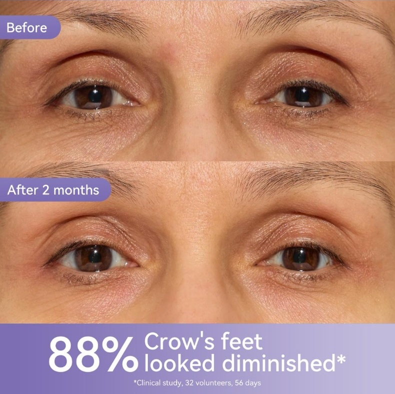 Don't just hopeāsee the visible change! This powerful before-and-after comparison is based on aĀ clinical study with 32 volunteers over 56 days. The result? AnĀ 88% reduction in the appearance of crow's feet. The stark visual evidence speaks for itself, showcasing the potential for dramatically smoother skin around your eyes. Imagine this result as your own.