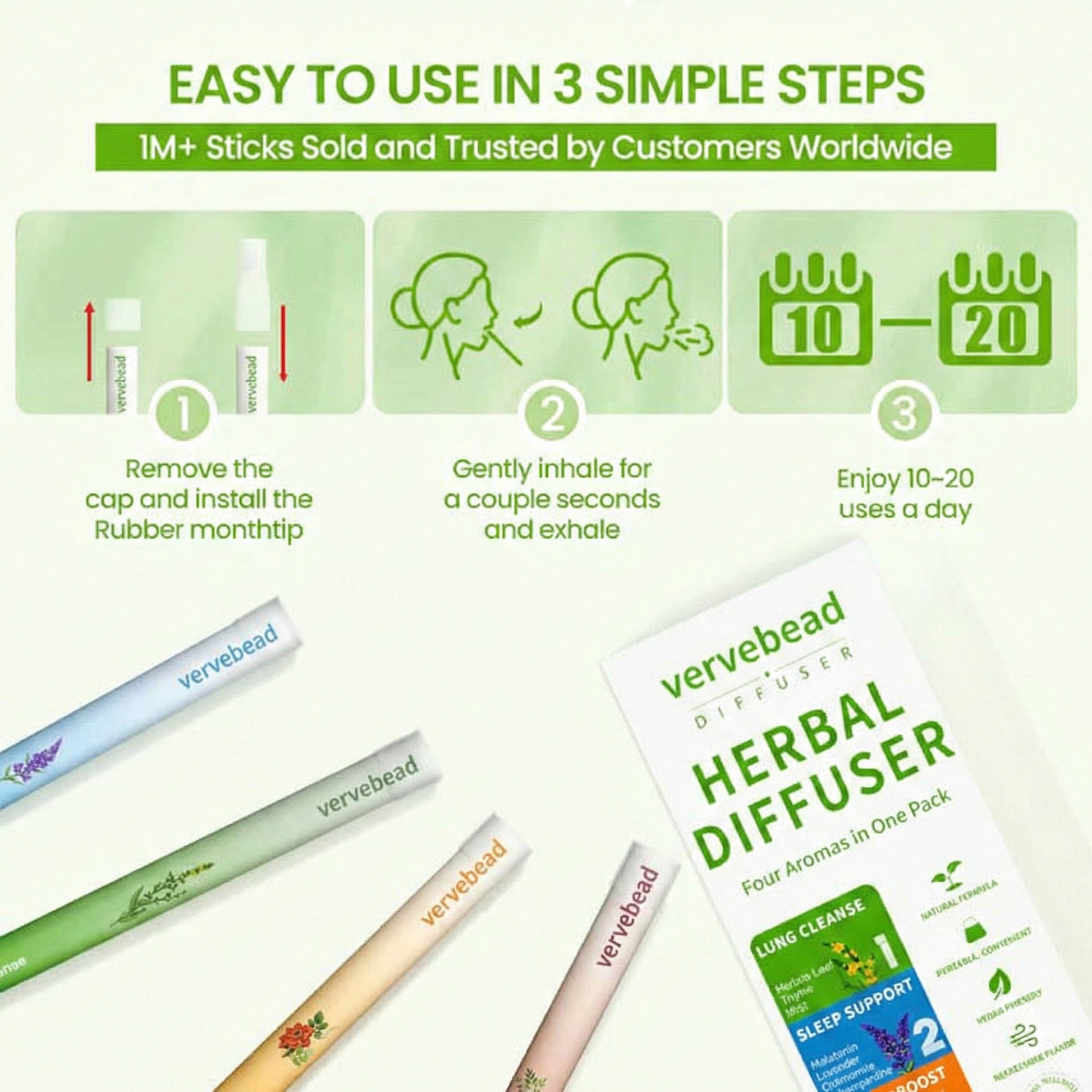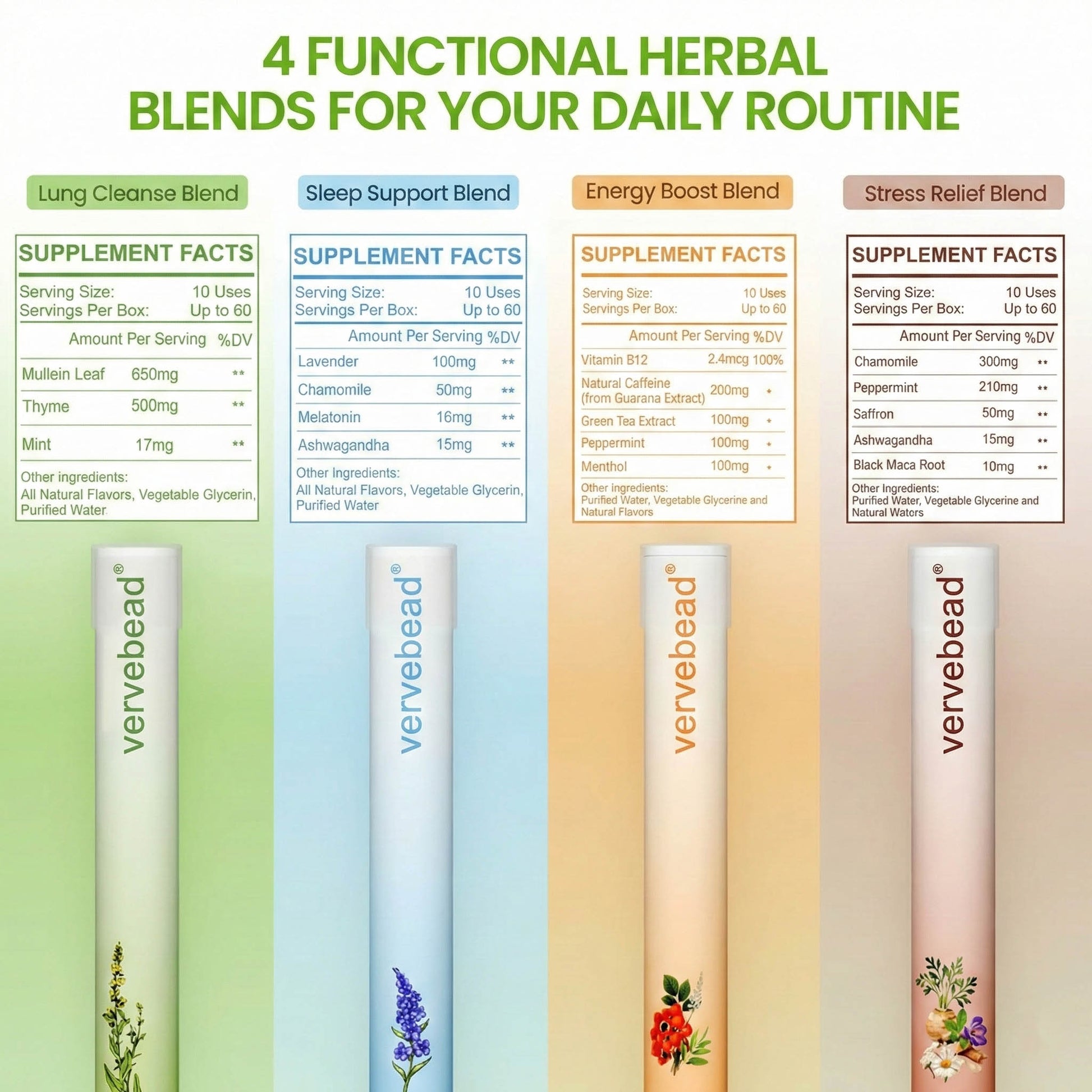 Elevate your daily routine with the vervebead Aroma Diffuser Set, featuring four unique botanical blends. Each diffuser delivers 600 refreshing puffs, crafted with pure, natural ingredients for a clean and portable experience.